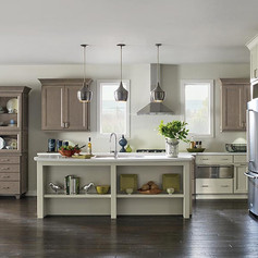 MODERN FARMHOUSE KITCHEN: Elegance made comfortable and transitional to complement the style of your home. Soft creams and greys, warm finishes and subtle accents keep this look fresh. A custom island really completes the look!